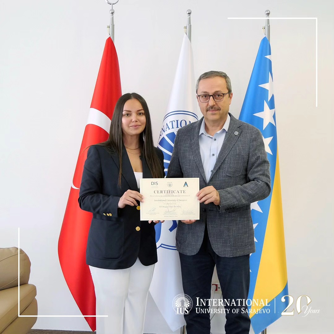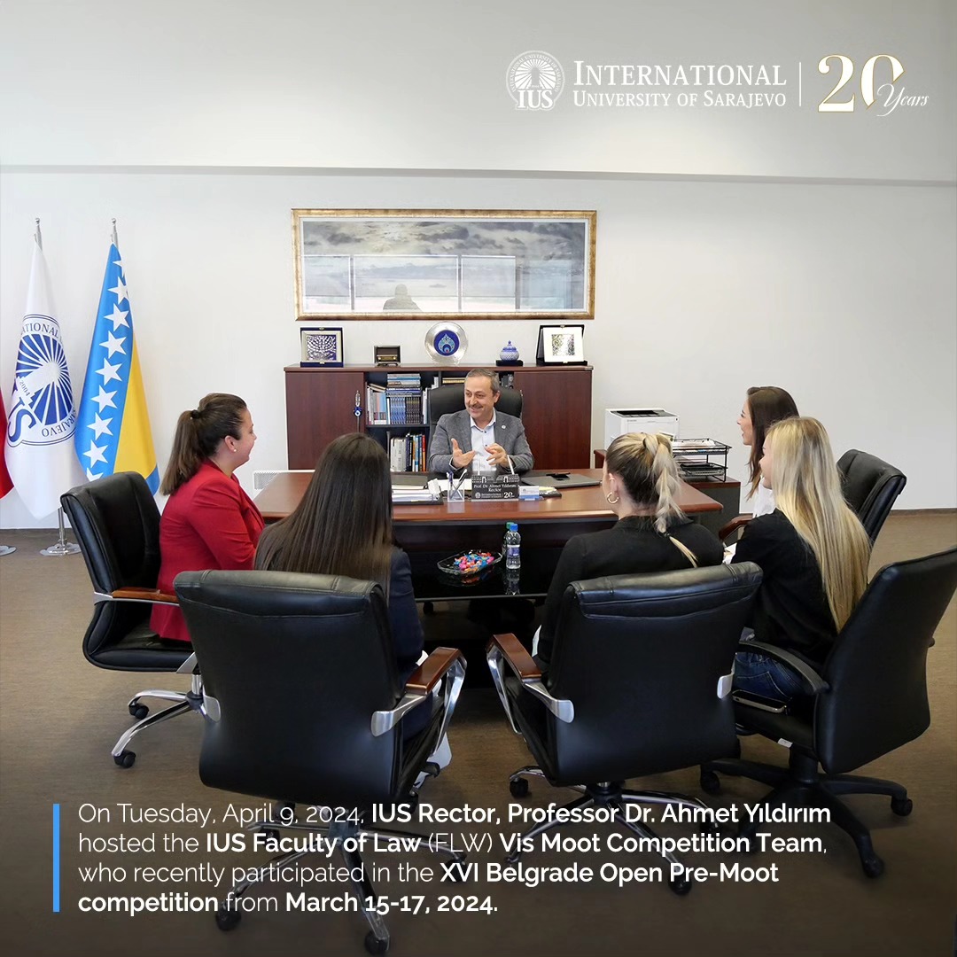 On Tuesday, April 9, 2024, IUS Rector, Professor Dr. Ahmet Yıldırım hosted the IUS Faculty of Law (FLW) Vis Moot Competition Team, who recently participated in the XVI Belgrade Open Pre-Moot competition from March 15-17, 2024. Accompanied by FLW Dean, Associate Professor Dr. Ena Kazić-Çakar, the students shared insights with Prof. Yıldırım regarding the profound significance of their participation in the competition and the invaluable knowledge and experience gained in the field of international arbitration. During the meeting, the team also seized the opportunity to present Prof. Yıldırım with a Certificate of Appreciation. This certificate serves as a token of gratitude for the Rector's support, dedication, and unwavering enthusiasm, all of which played key roles in enabling the team to partake in this prestigious and impactful competition.